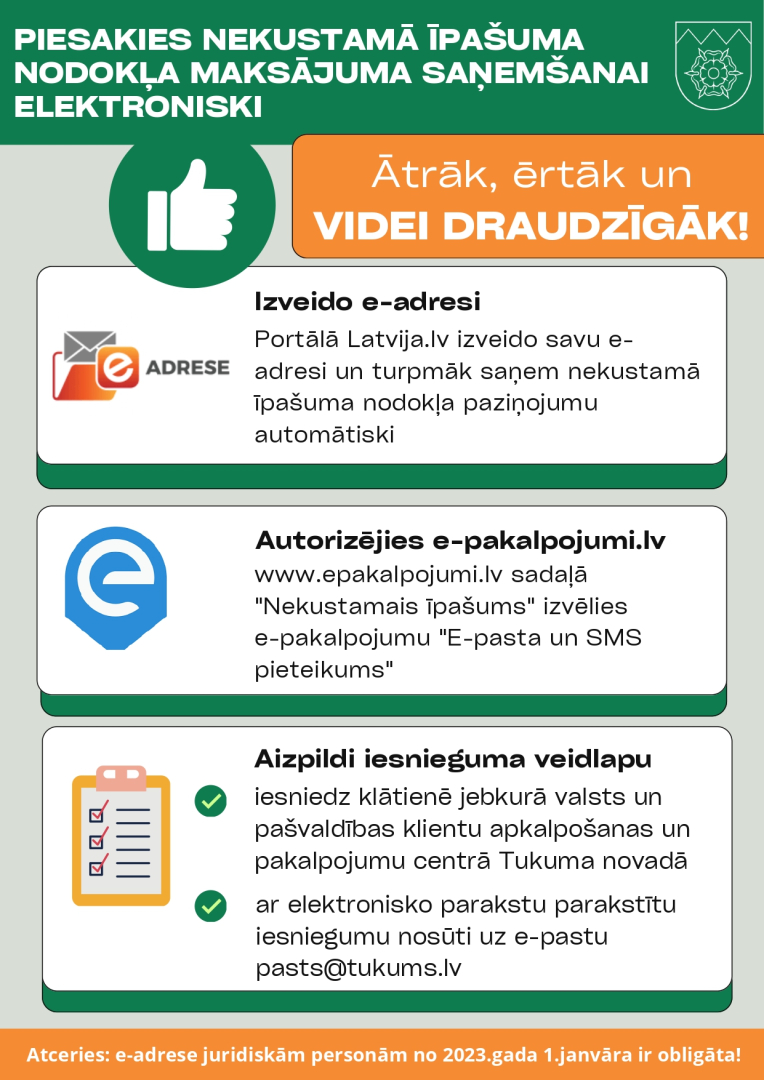 - Aktivizē e-adresi tīmekļa vietnē www.latvija.lv, attiecīgi nekustamā īpašuma nodokļa maksāšanas paziņojumu saņemsiet e-adresē.