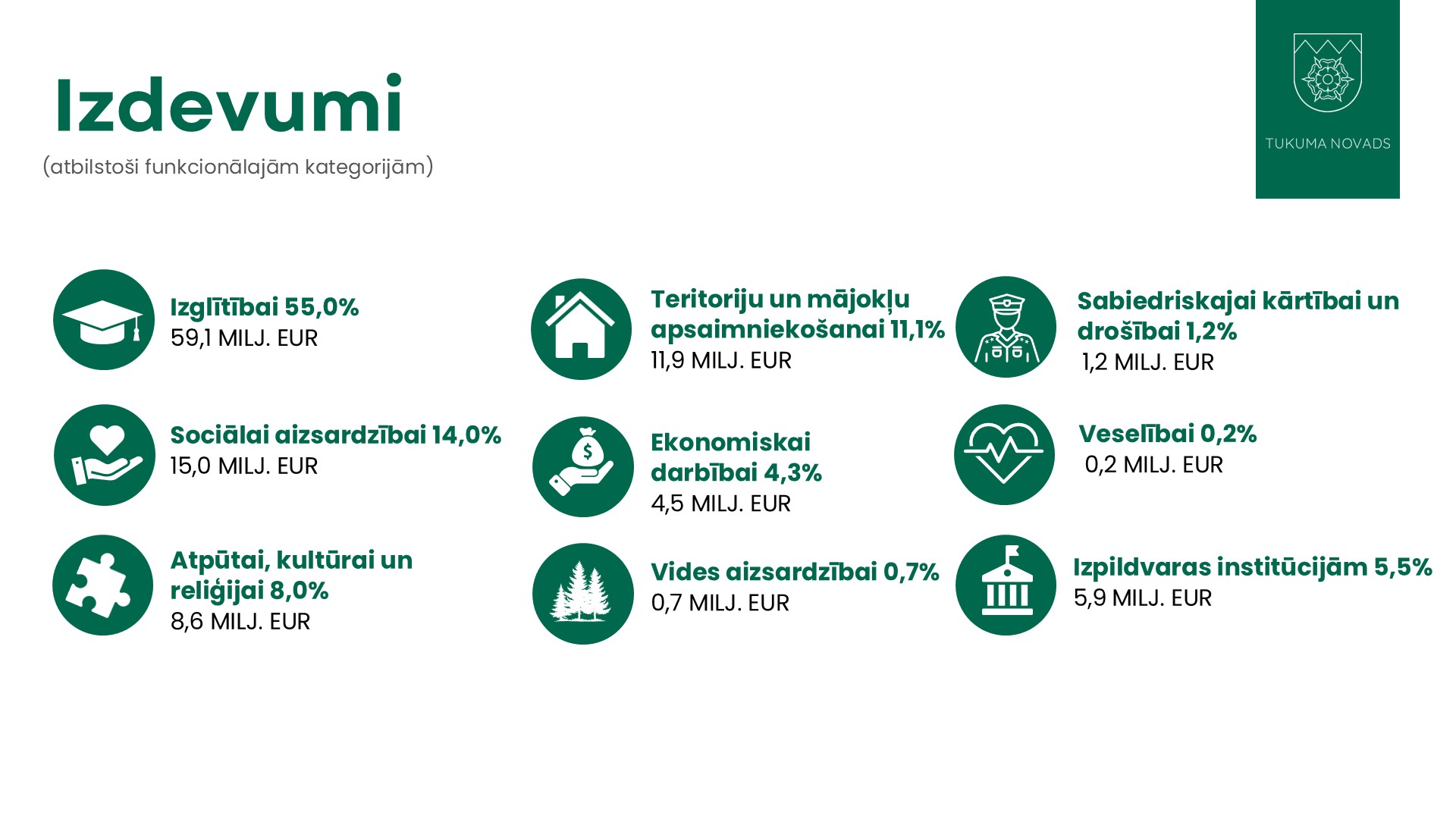Tukuma novada pašvaldības 2026. gada pamatbudžeta izdevumi plānoti 107 535 907 EUR apmērā un iedalīti desmit funkcionālajās kategorijās. Lielākais izdevumu īpatsvars paredzēts izglītībai (55 %), sociālajai aizsardzībai (14 %) un teritoriju un mājokļu apsaimniekošanai (11,1 %).