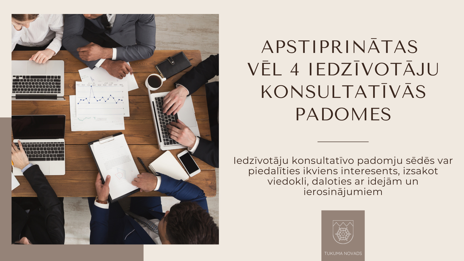 Ņemot vērā saņemtos pieteikumus un konsultatīvo padomju nolikumus, 30. oktobrī Tukuma novada dome apstiprināja šādus padomju sastāvus:
