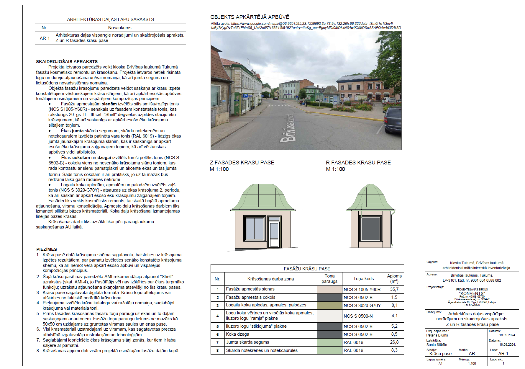 Augusta vidū SIA “Konvents” ekspertes – Mg. Arch., arhitekte Līva Garkāje un Mg. Arch., arhitekte Santa Stūrīte – arhitekta un būvmākslas objektu restaurācijas vecmeistara Pētera Blūma vadībā strādāja Tukumā, Brīvības laukumā, uzmērot, pētot un noskaidrojot mazās būves arhitektūras unikalitāti un izmaiņas dažādos vēsturiskos posmos. Projekta rezultātā ir sagatavots ēkas krāsu pases projekts un rekomendācijas ēkas saglabāšanai.