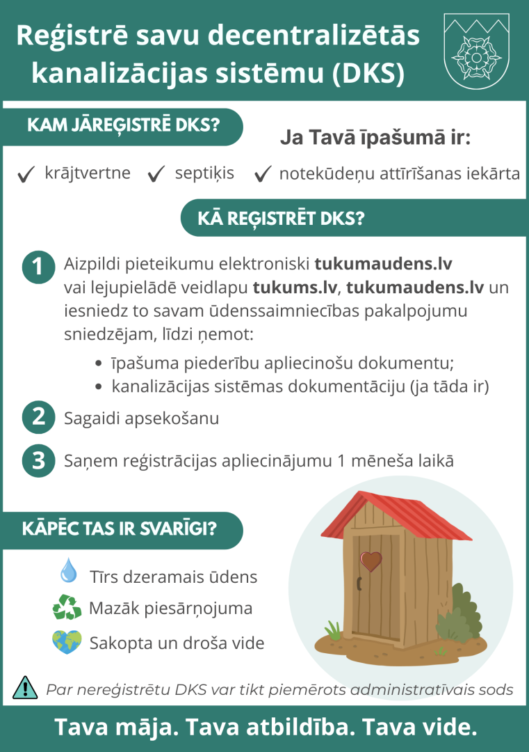 Tukuma novada pašvaldība aicina ikvienu reģistrēt savu decentralizēto kanalizācijas sistēmu (DKS) un pārliecināties, ka tā ir droša, atbilstoša prasībām un nerada kaitējumu kaimiņiem vai apkārtējai videi.