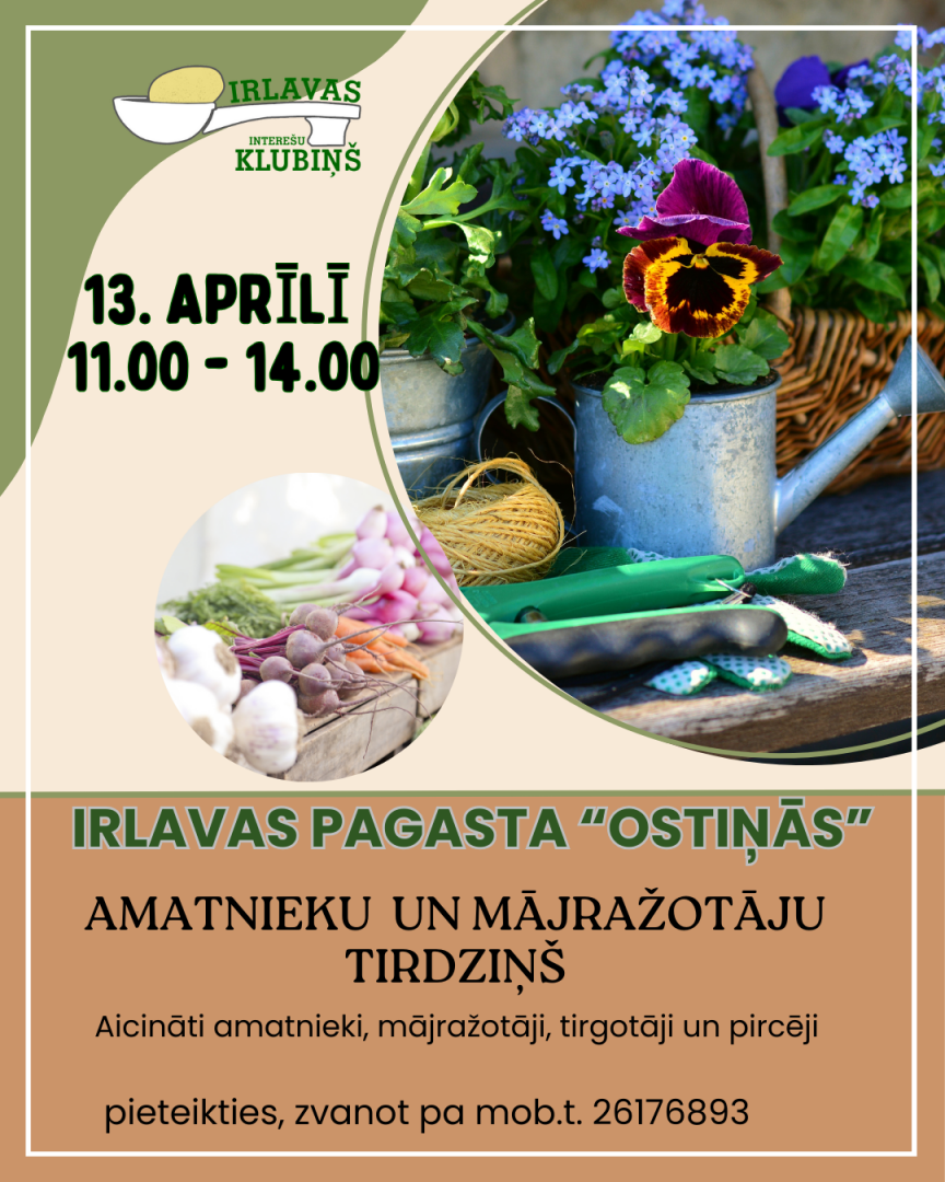 13.aprīlī plkst. 11.00 - 14.00 Irlavas pagasta "Ostiņās" notiks amatnieku un mājražotāju tirdziņš.