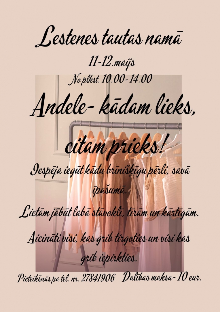 11. un 12. maijā no plkst. 10.00 līdz 14.00 Lestenes Tautas namā Andele "Kādam lieks, citam prieks".