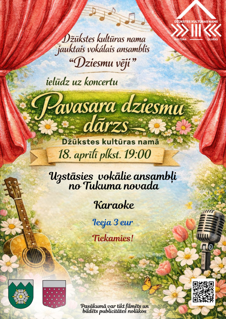 18. aprīlī plkst. 19.00 Džūkstes Kultūras namā ansambļu sadziedāšanās koncerts “Pavasara dziesmu dārzs”.