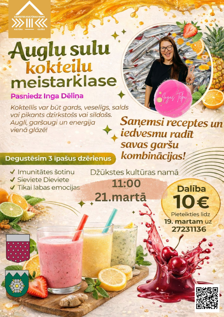 21. martā plkst. 11.00 Džūkstes Kultūras namā augļu sulu kokteiļu meistarklase.