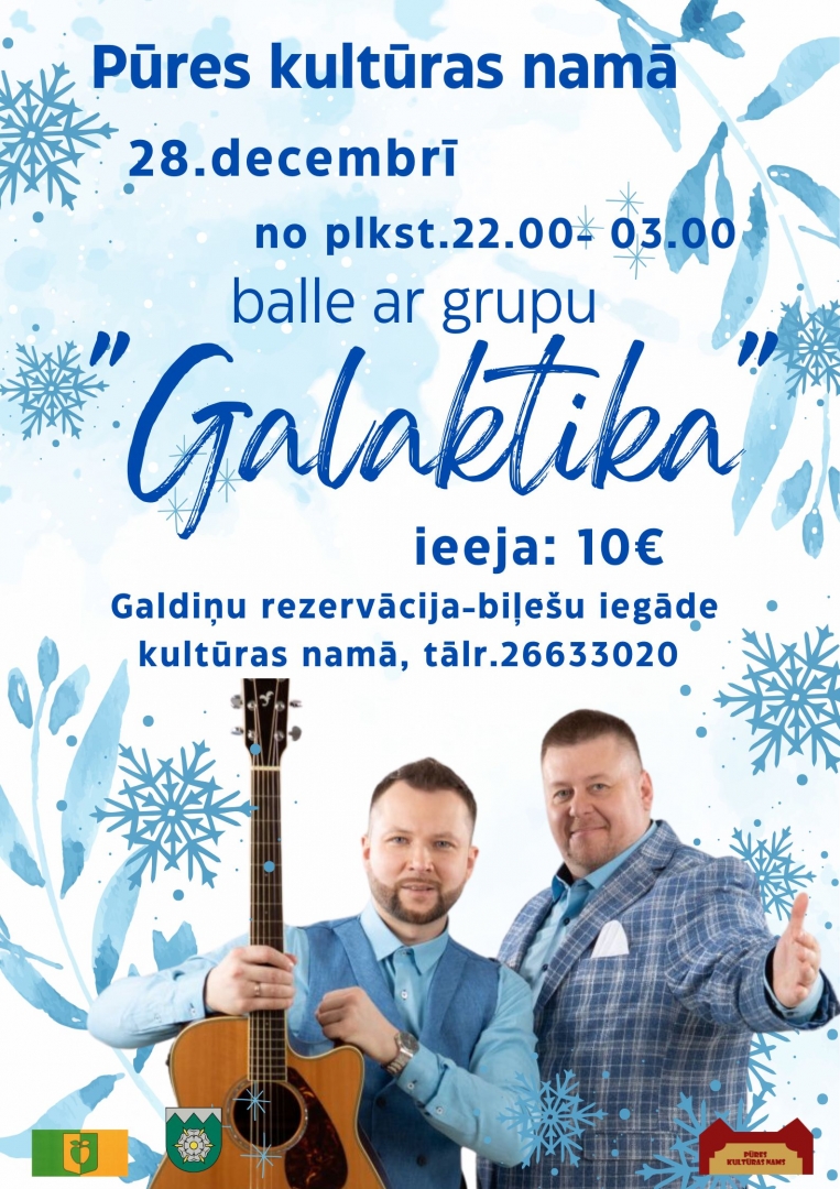 28. decembrī no plkst. 22.00 līdz 3.00 Pūres Kultūras namā balle kopā ar grupu "Galaktika".
