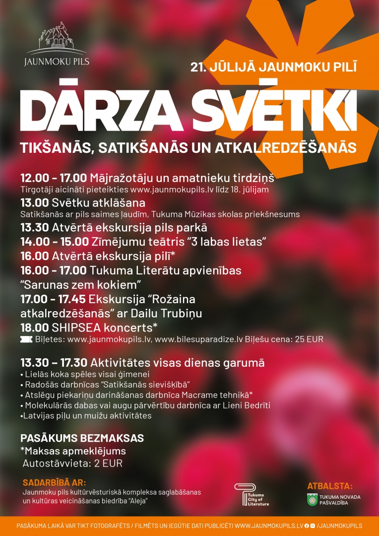 21. jūlijā Jaunmoku pilī tradicionāli, pašā vasaras plaukumā, norisināsies viens no gada gaidītākajiem notikumiem – Dārza svētki. Šogad, atzīmējot SIA “Jaunmoku pils” 20 gadu jubileju, svētki tiks aizvadīti tēmas “Tikšanās, satikšanās un atkalredzēšanās” formātā. Diena būs piepildīta ar satikšanos dažādās darbnīcās, zīmējumu teātri visai ģimenei, tikšanos ar piļu un muižu draugiem, tirdziņu, ekskursijām, spēlēm un citām aktivitātēm lieliem un maziem. Svētku noslēgumā notiks SHIPSEA koncerts.