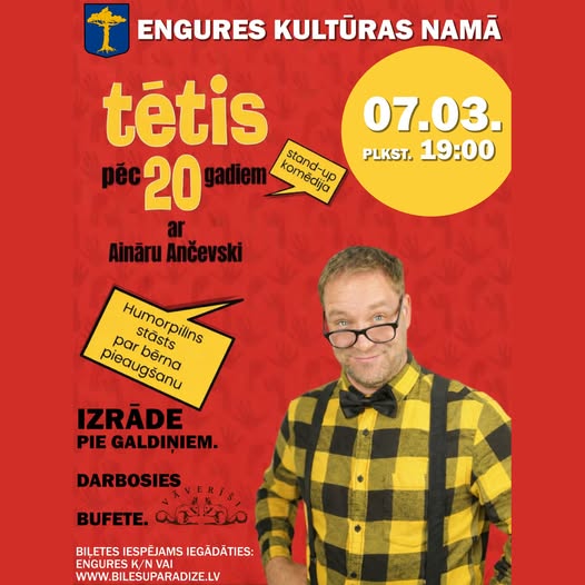 7. martā plkst. 19.00 Engures Kultūras namā lieliskā aktiera Aināra Ančevska stand-up komēdija "Tētis pēc 20 gadiem"!