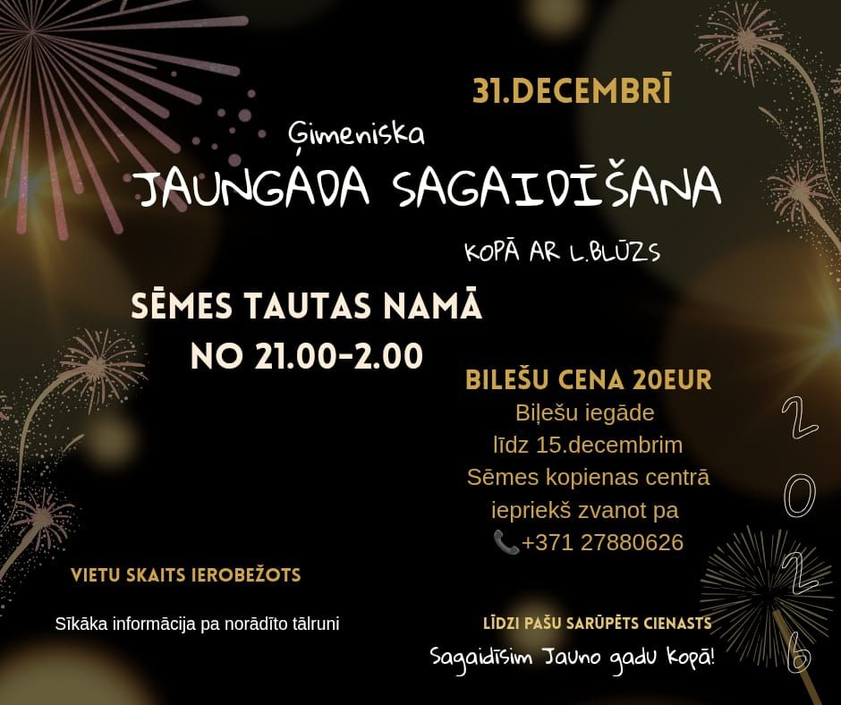 31. decembrī plkst. 21.00-02.00 ģimeniska Jaunā gada sagaidīšana Sēmes Tautas namā kopā ar L.Blūzu.