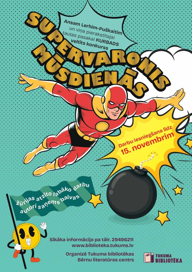 Tukuma bibliotēka rīko konkursu “SUPERVARONIS MŪSDIENĀS”, veltītu Ansim Lerhim-Puškaitim un viņa pierakstītajai tautas pasakai “KURBADS”. Konkursā aicinām piedalīties Tukuma novada skolu audzēkņus vecuma grupā no 2. līdz 5. klasei.