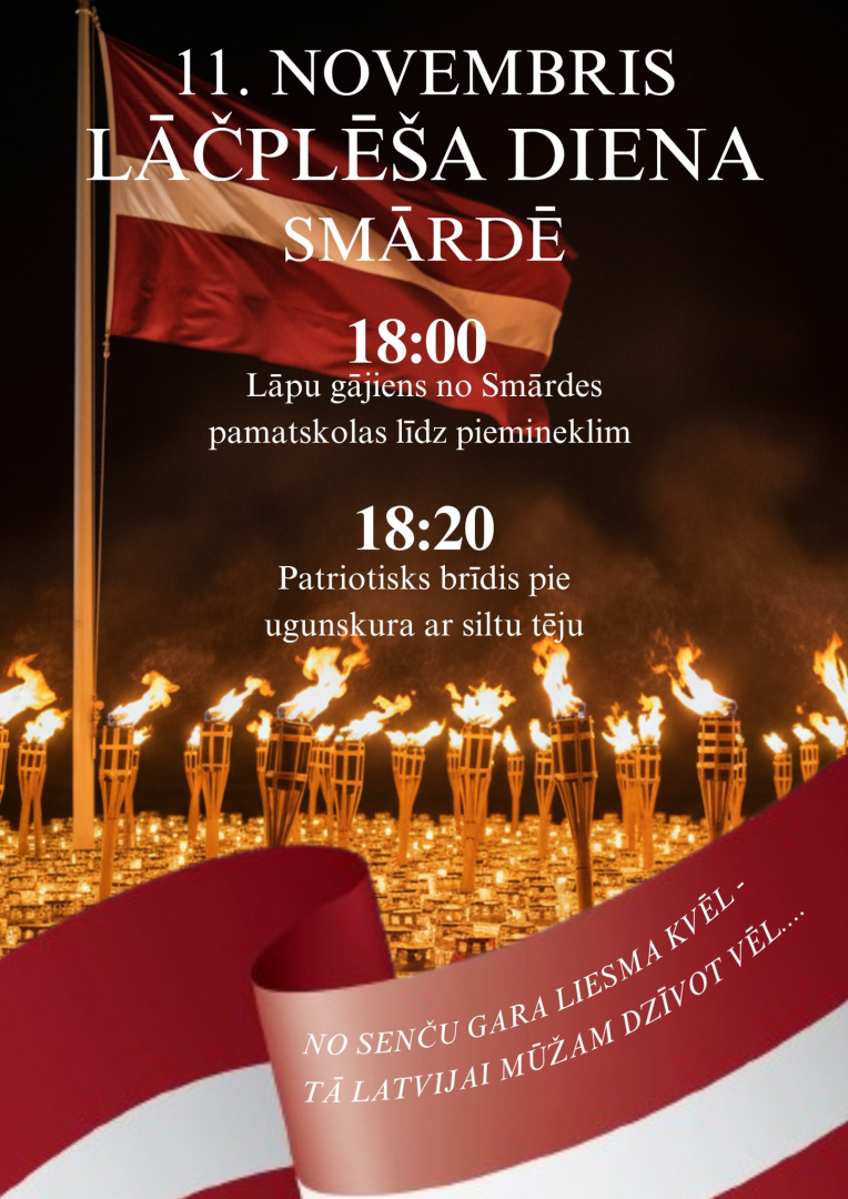 11. novembrī plkst. 18.00 no Smārdes pamatskolas līdz piemineklim lāpu gājiens, savukārt plkst. 18.20 patriotisks brīdis ar tēju pie ugunskura.