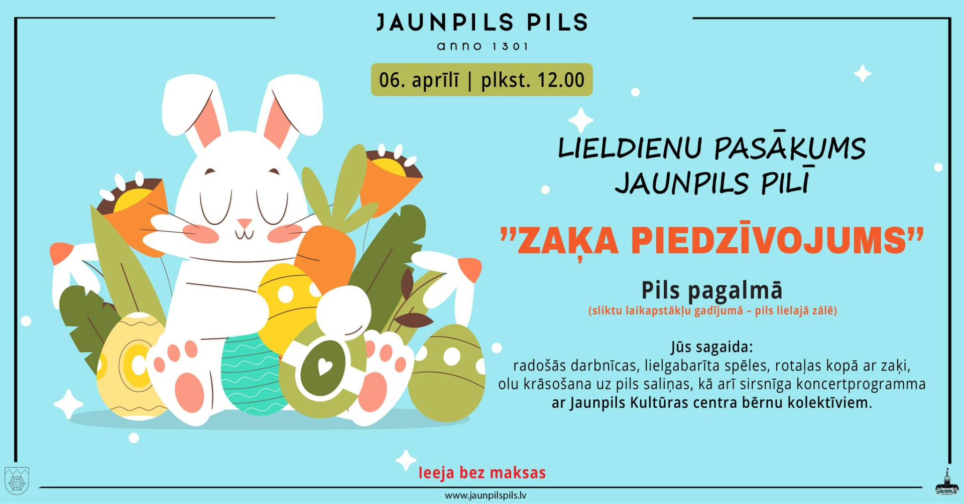 Otrajās Lieldienās, 6. aprīlī plkst. 12.00, Jaunpils pils pagalmā (sliktu laikapstākļu gadījumā – pils lielajā zālē) ikviens aicināts uz prieka, radošuma un pavasarīgas noskaņas pilnu dienu.