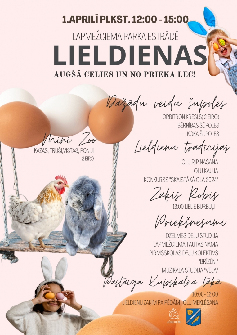 1. aprilī tLapmežciema parka estrādē no plkst. 12.00 līdz 15.00 notiks Lieldienu pasākums " Augšā celies un no prieka lec" !