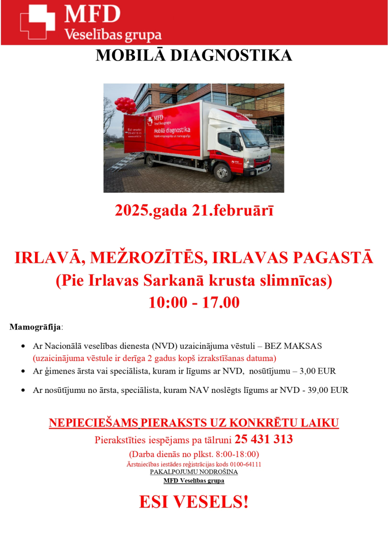 21. februārī no plkst. 10.00 līdz 17.00 pie Irlavas Sarkanā krusta slimnīcas iespējams pierakstīties uz mobilās diagnostikas - mamogrāfijas pakalpojumu.
