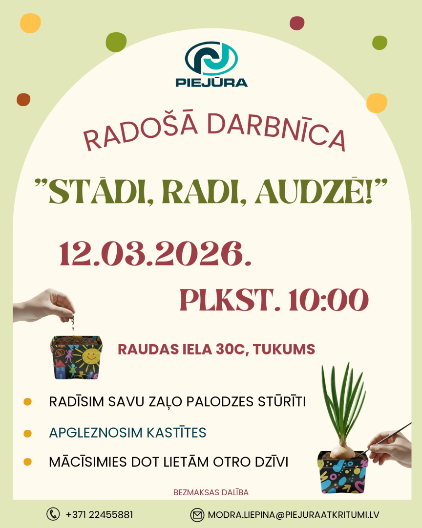 Lai veicinātu bērnu izpratni par dabas procesiem un videi draudzīgu dzīvesveidu, SIA “Atkritumu apsaimniekošanas sabiedrība “PIEJŪRA”” aicina jaunos dabas draugus uz iedvesmojošu pasākumu. Šī gada 12. martā plkst. 10.00 Raudas ielā 30c, Tukumā, norisināsies radošā darbnīca “Stādi, radi, audzē!”, kuras laikā ikviens dalībnieks varēs ļauties fantāzijai un izveidot savu unikālo palodzes dārziņu.