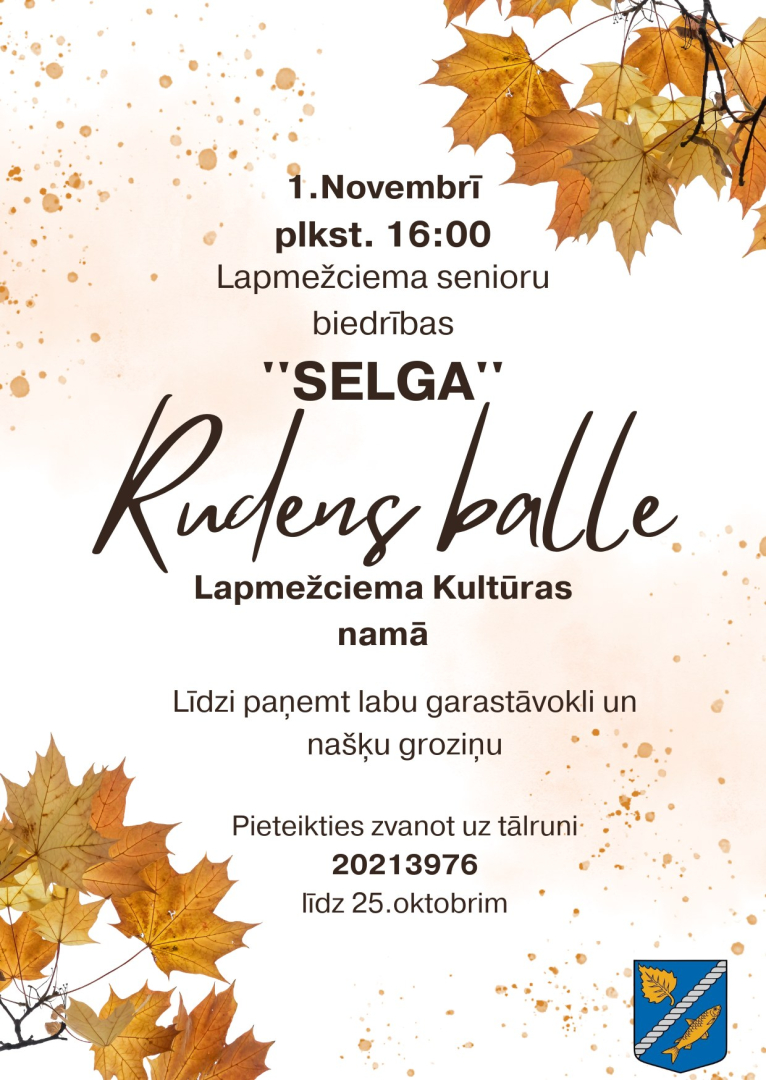 1. novembrī plkst. 16.00 Lapmežciema Tautas nama lielajā zālē Lapmežciema senioru biedrība ''Selga" aicina rudeni nosvinēt svinīgā un muzikālā gaisotnē - Tautas namā norisināsies svinīgs koncerts un kopīgs deju solis ''Rudens balle''