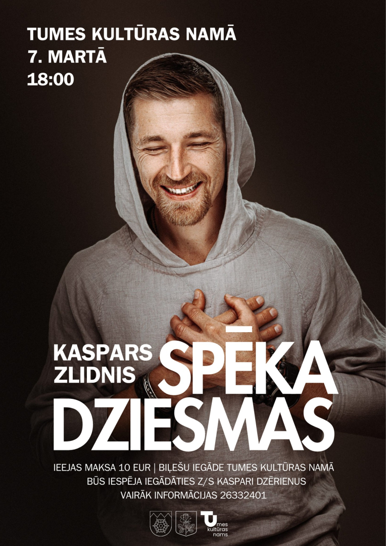 7. martā plkst. 18.00 Tumes Kultūras namā Sieviešu dienai veltīts koncerts kopā ar Kasparu Zlidni - “Spēka dziesmas”.