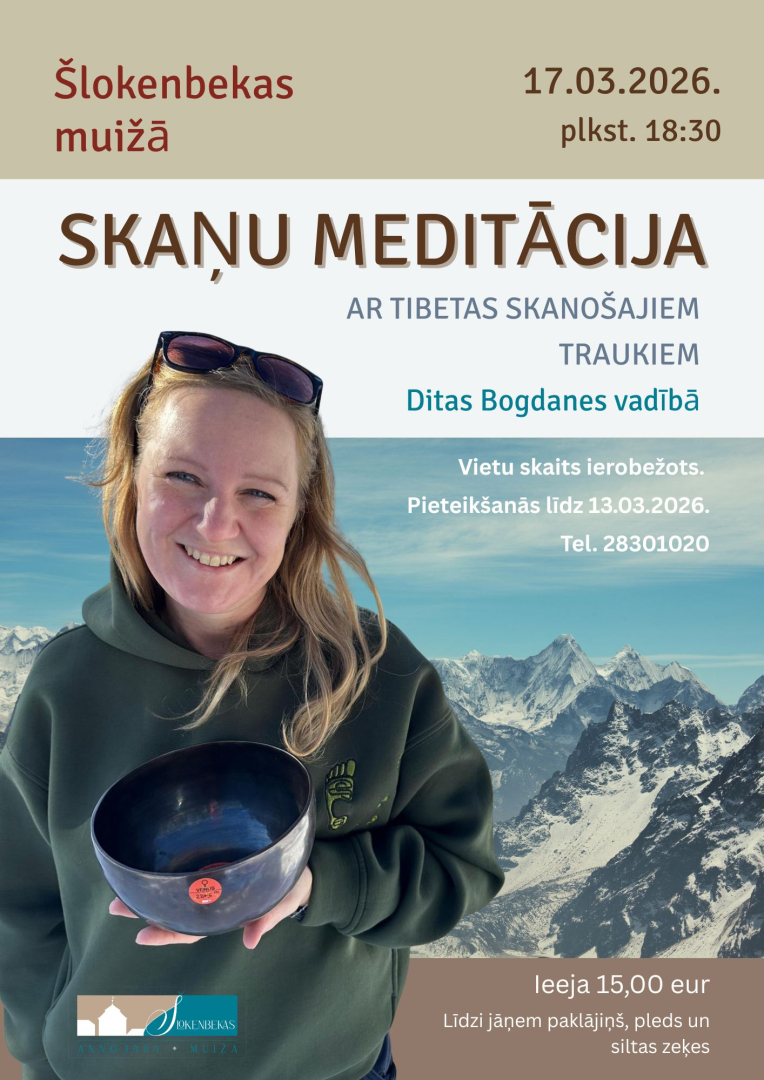 17. martā plkst. 18.30 Šlokenbekas muižā skaņu meditācija ar Tibetas skanošajiem traukiem Ditas Bogdanes Ditabo vadībā.