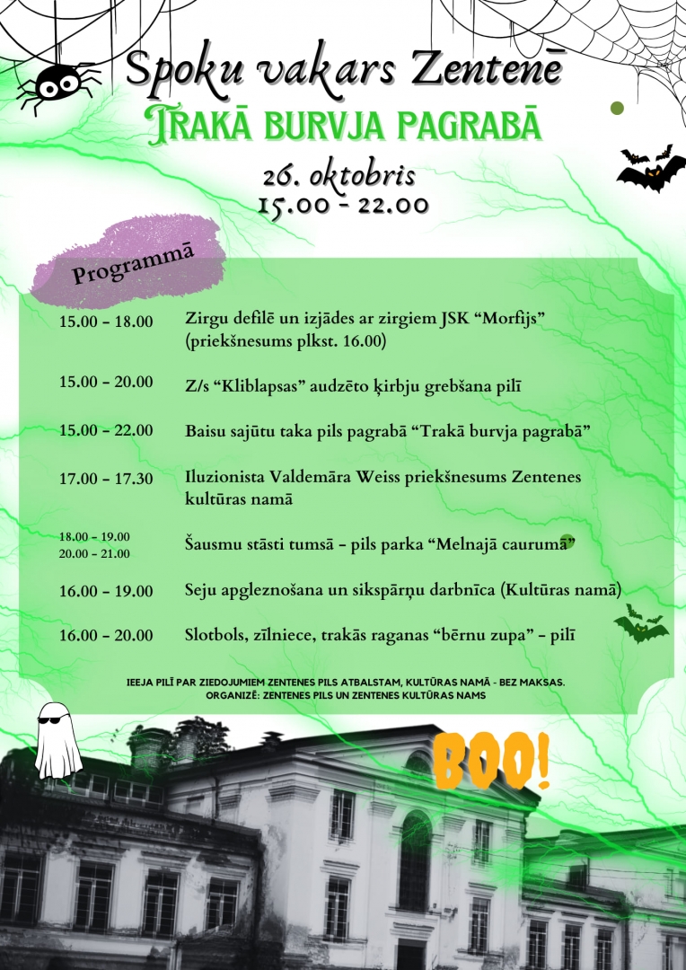26.oktobrī no plkst. 15.00 līdz 22.00 Zentenes pilī un Zentenes Kultūras namā Helovīnu pasākums.