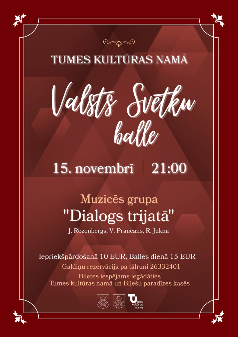 15. novembrī plkst. 21.00 Tumes Kultūras namā valsts svētku balle kopā ar grupu "Dialogs trijatā".