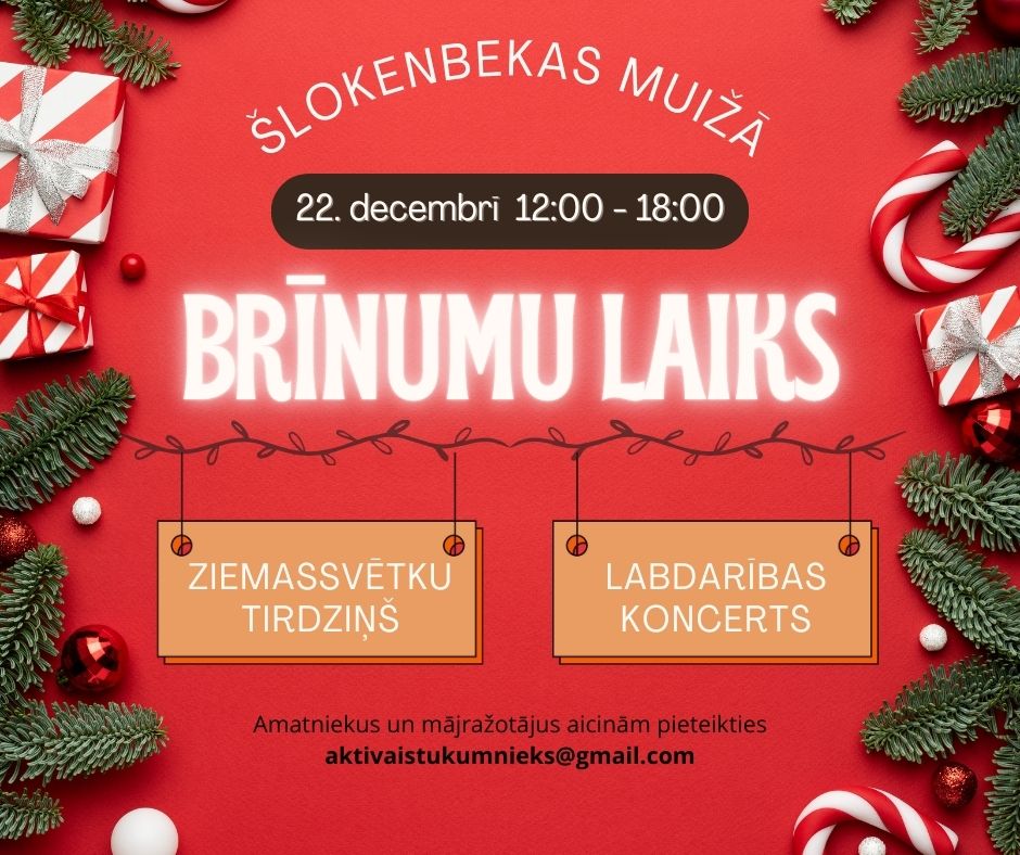 "Brīnumu laiks" – Ziemassvētku tirdziņš un labdarības koncertus Šlokenbekas muižā 22. decembrī no plkst. 12.00 līdz 18.00.