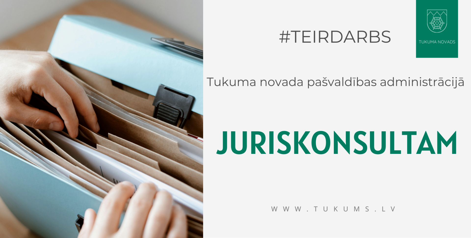 Tukuma novada pašvaldības iestāde "Pašvaldības administrācija" Juridiskā nodaļa izsludina pretendentu pieteikšanos uz amata "Juriskonsults" vakanci (prof. kods 2619 01) uz nenoteiktu laiku.