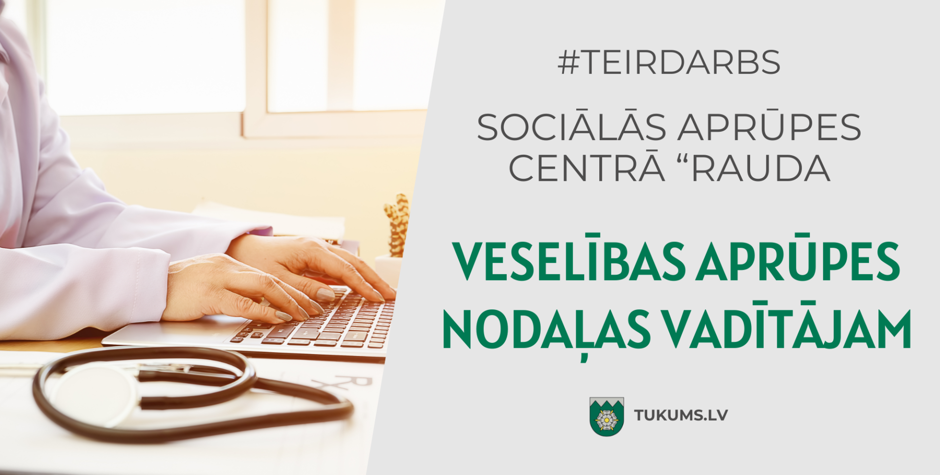 Tukuma novada pašvaldības iestāde "Sociālās aprūpes centrs "Rauda"" izsludina pretendentu pieteikšanos uz veselības aprūpes nodaļas vadītāja (klasifikācijas kods 1342 04) amatu uz noteiktu laiku.